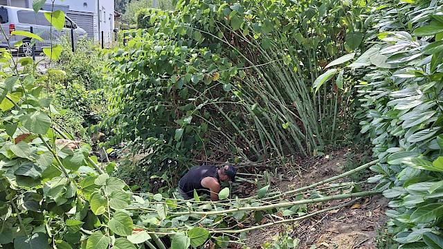 Die Projektgruppe Biodiversität hat im Juli mit der Beseitigung der invasiven Art des Japanischen Staudenknöterichs begonnen.